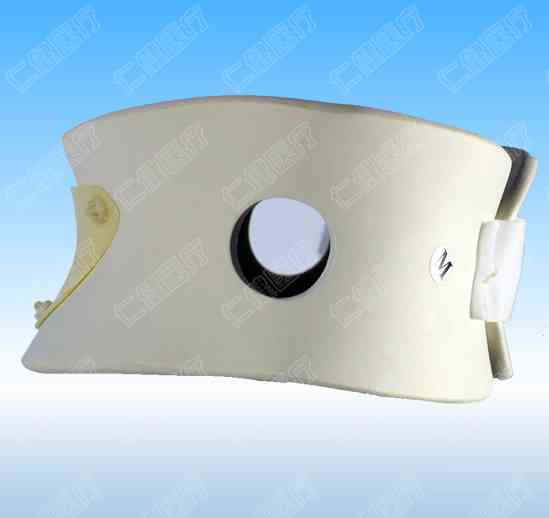 颈托四周有透气孔,前后有塑料板加固,有粘扣,可调节大小,主要用于颈椎骨折固定,脱位复位固定等。